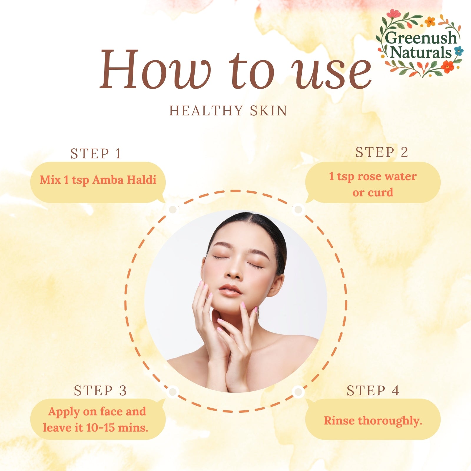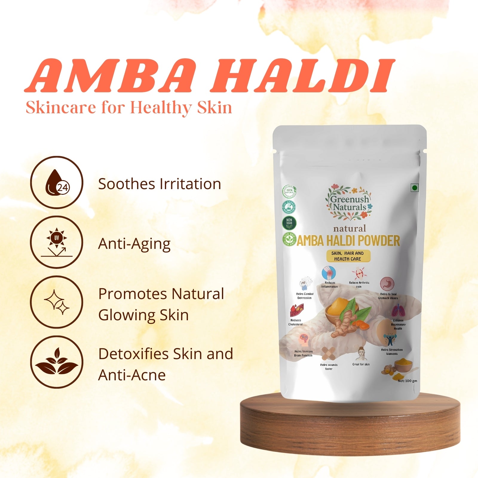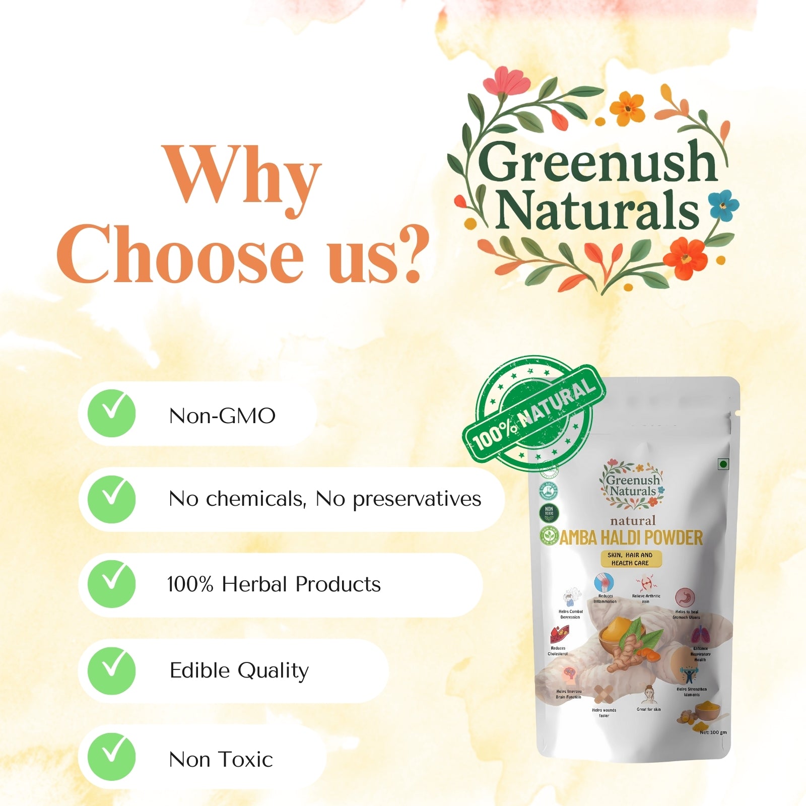 Enhance your skin, hair, and overall health with GREENUSH NATURAL Amba Haldi Powder. Made with 100% pure organic Haldi, also known as Kasthuri Manjal or Wild Turmeric, this powder is a natural and preservative-free option for your daily self-care routine. Say goodbye to chemicals and hello to the power of Ayurveda.