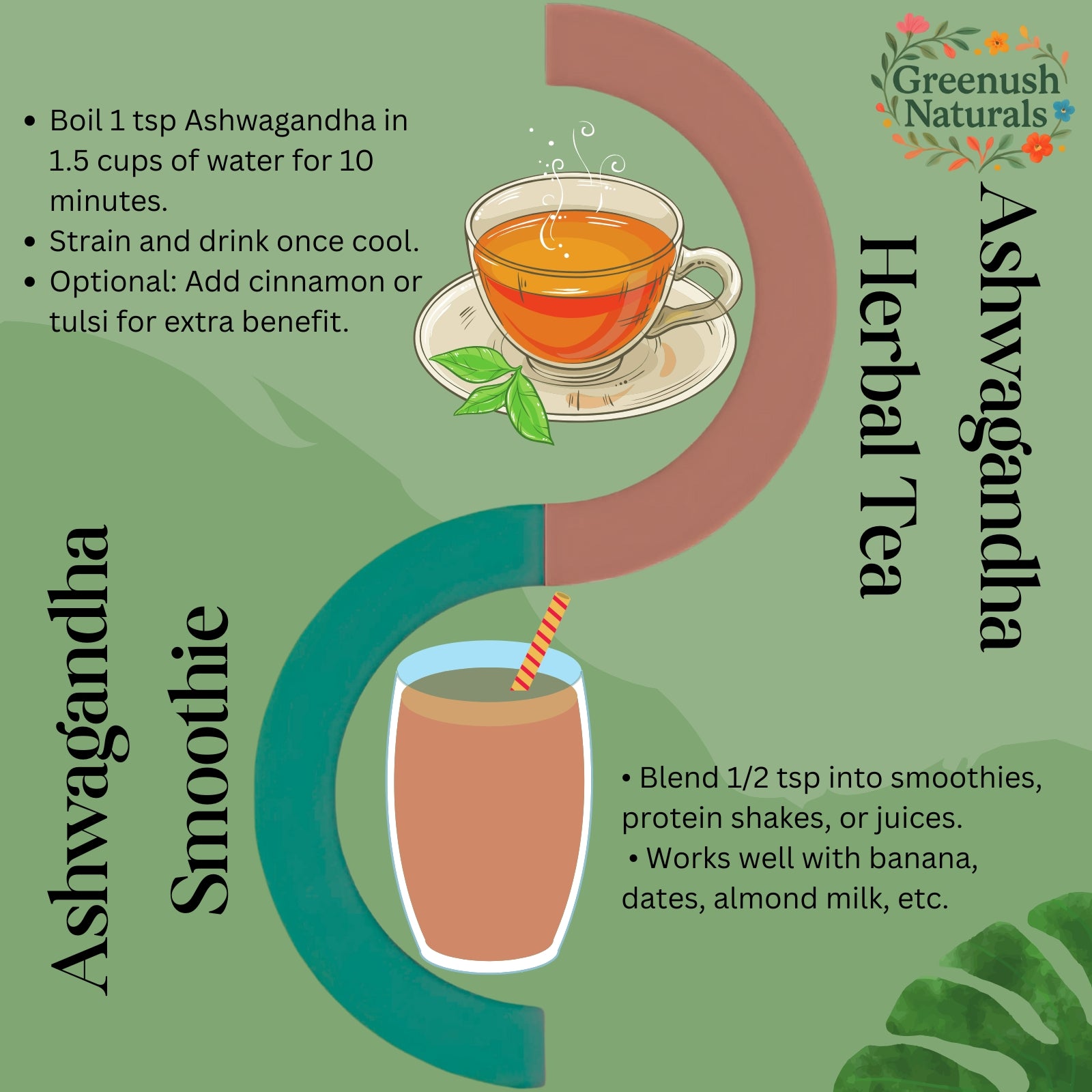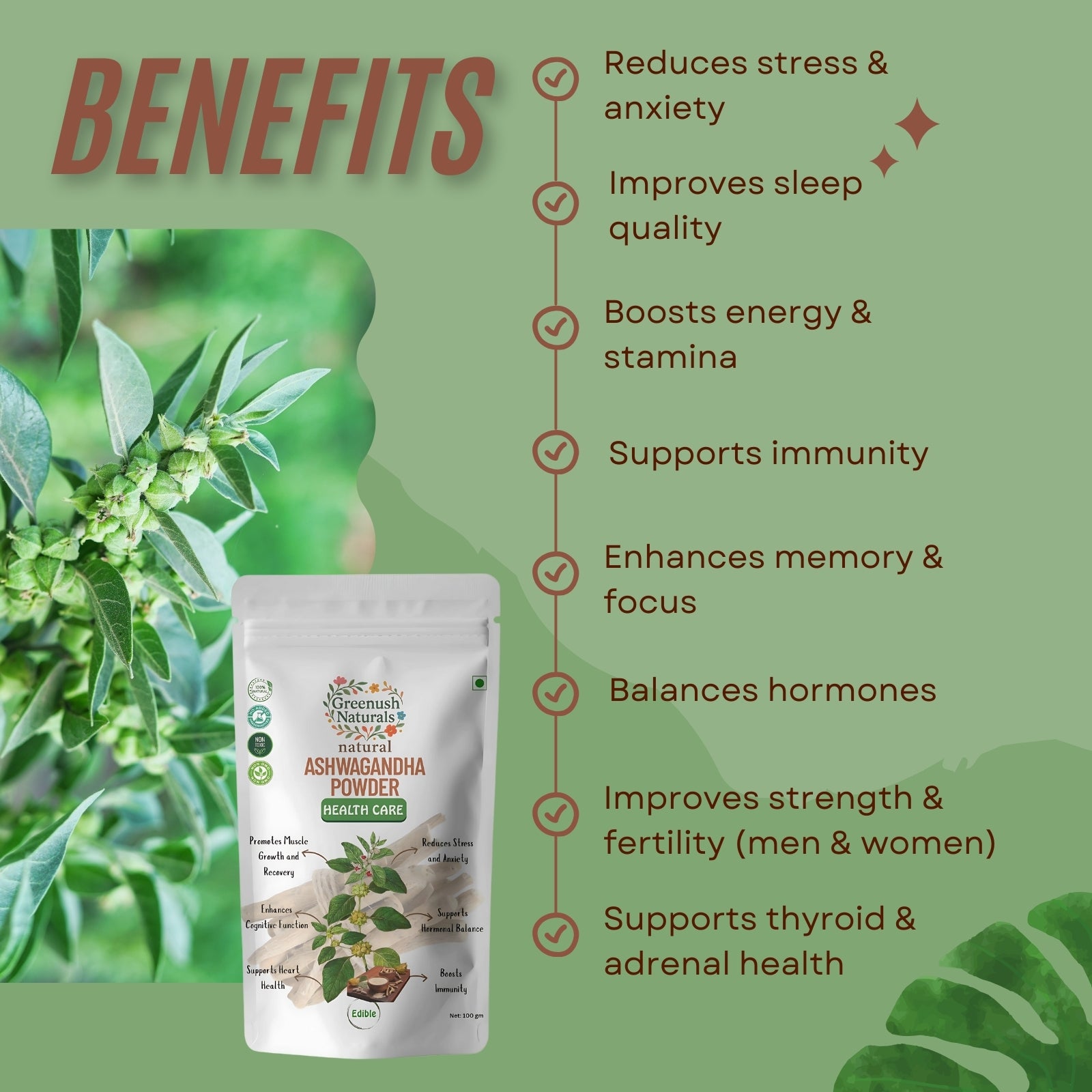 GREENUSH NATURALS Ashwagandha Powder is 100% pure and organic, making it a healthy and natural option for stress relief and immunity support. With no preservatives, this Ashwagandha Podi is a reliable choice for the ultimate health care. Incorporate Amukkara Kizhangu into your routine with this high-quality powder.