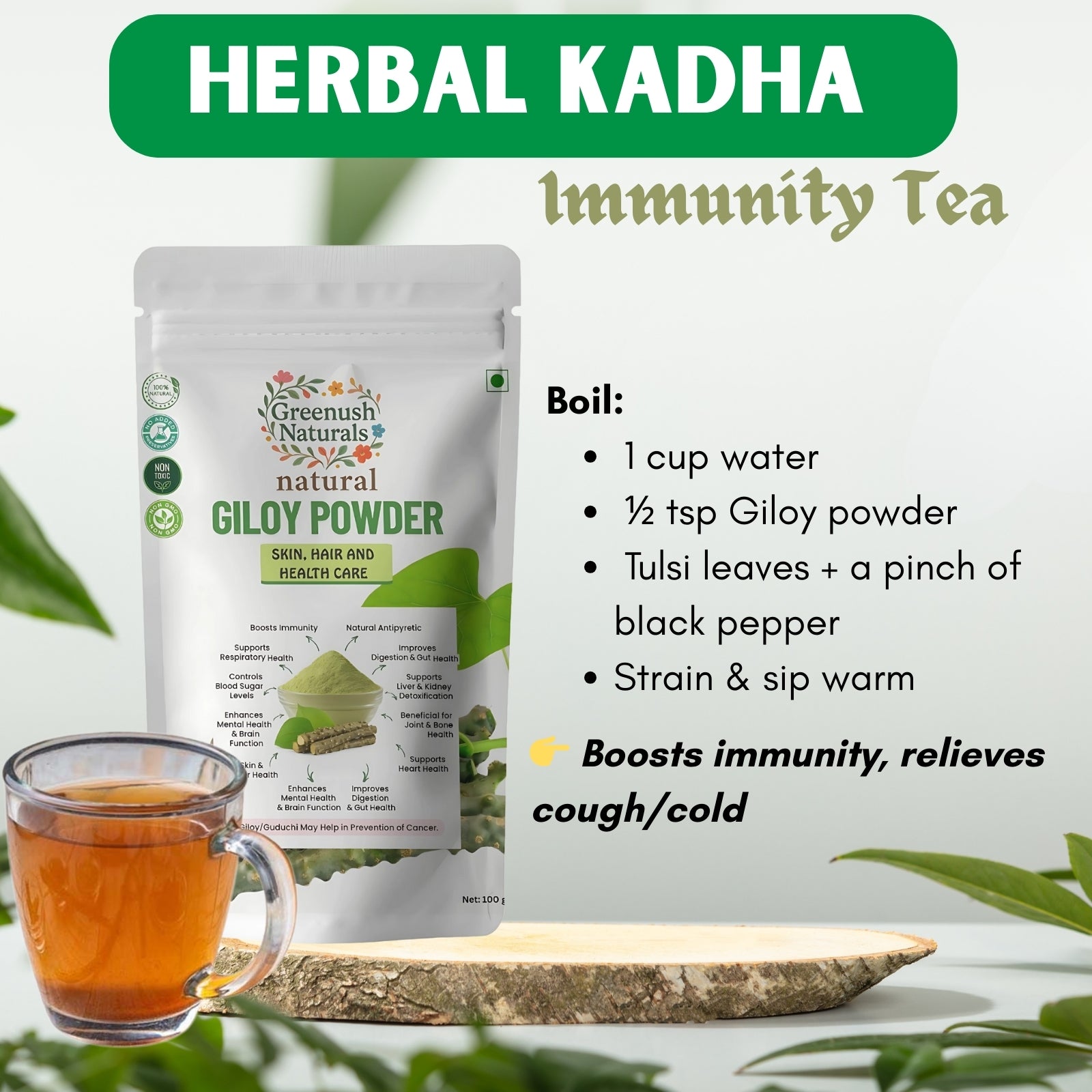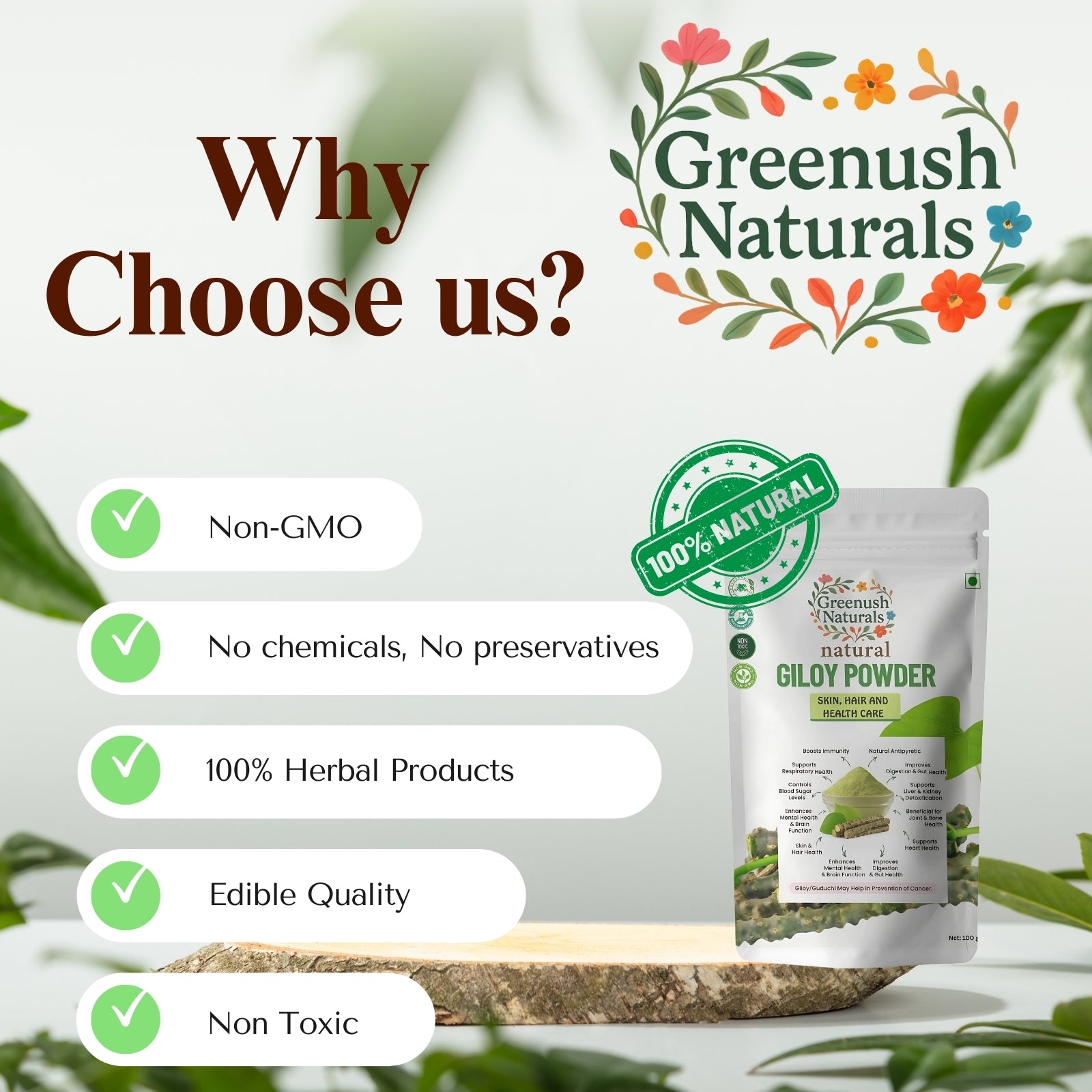 GREENUSH NATURAL Giloy Powder is the perfect addition to your skincare and haircare routine. Made from 100% pure organic Tinospora cordifolia, this powder helps detoxify your body, improve liver function, and promote healthy skin and hair. Say goodbye to added preservatives and hello to a natural, beneficial ingredient.