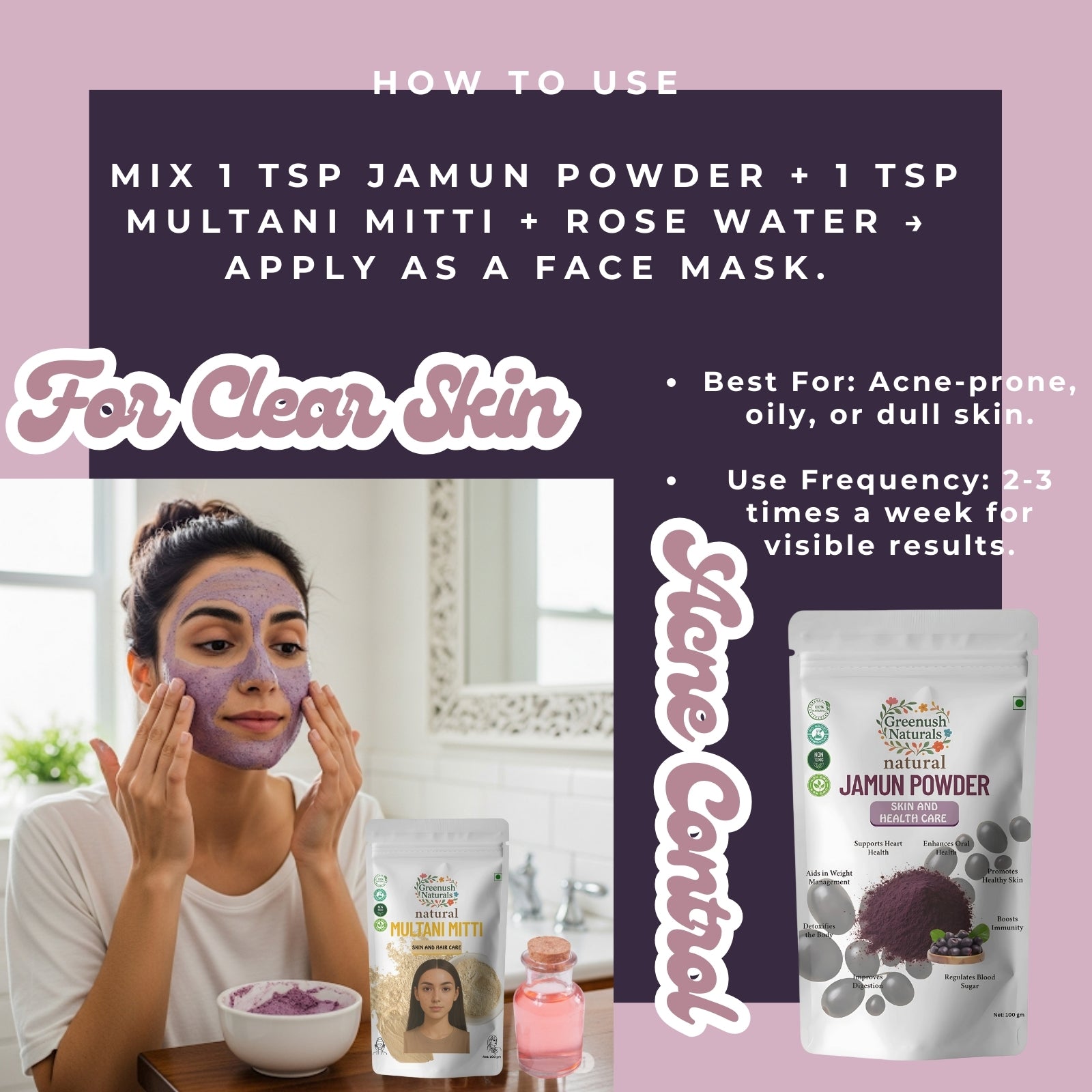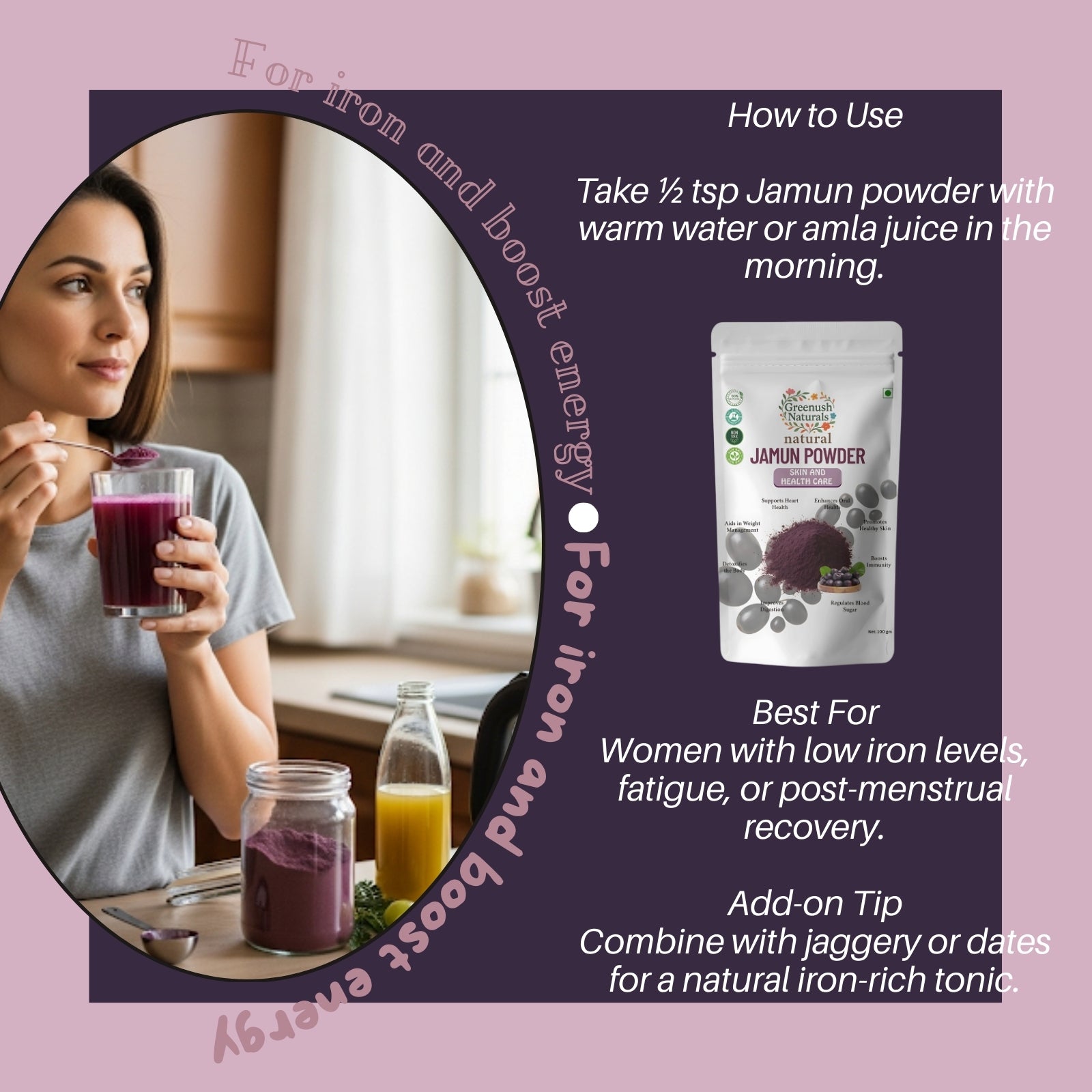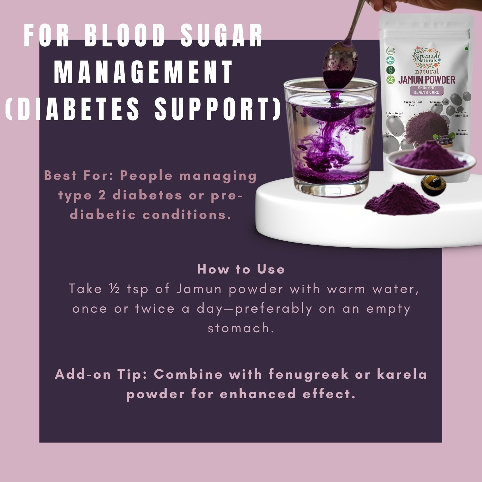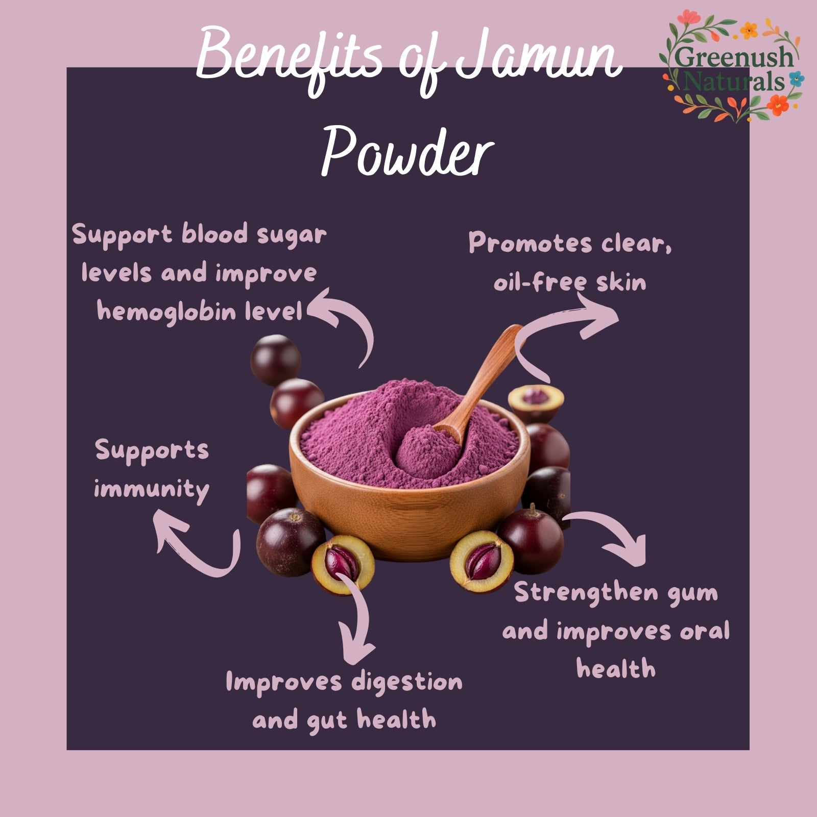 "Effortlessly regulate blood sugar levels with GREENUSH NATURAL Jamun Seed Powder. Our 100% pure organic powder is made from Syzygium Cumini, also known as Naaval Pazham, and contains no added preservatives. Trust the expertise of our all-natural product to support your health needs."