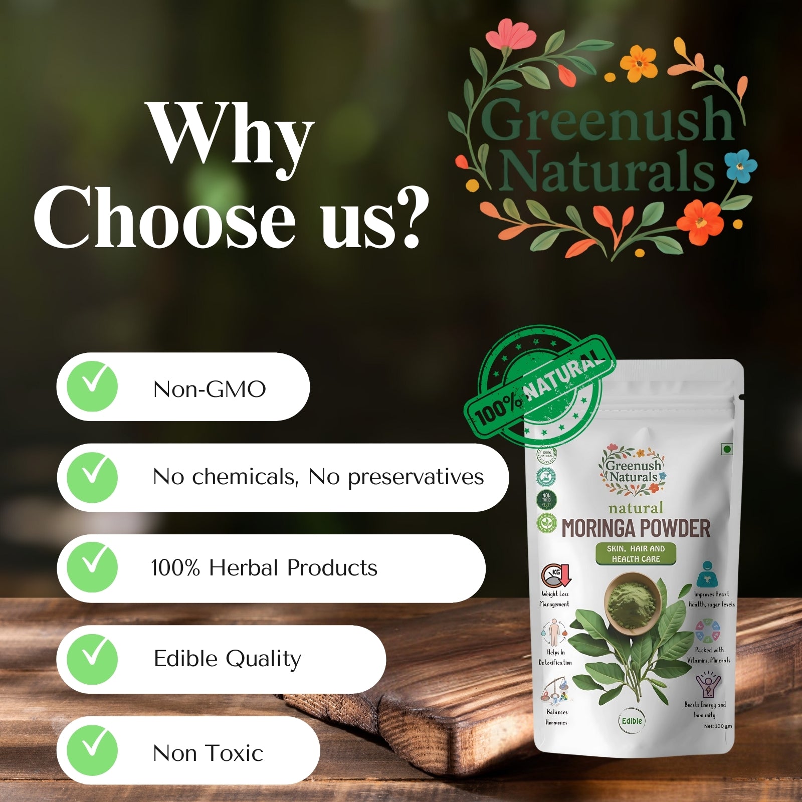 As an industry expert, trust GREENUSH NATURAL's Moringa Powder for optimal health. Made from Moringa Oleifera, known for its protein-rich and multi-vitamin properties, this organic powder is a great addition to your beauty regimen, promoting healthy hair and skin. With 100% purity, reap the benefits of Murungai Podi/Munagaku Podi/Muringa Podi easily.