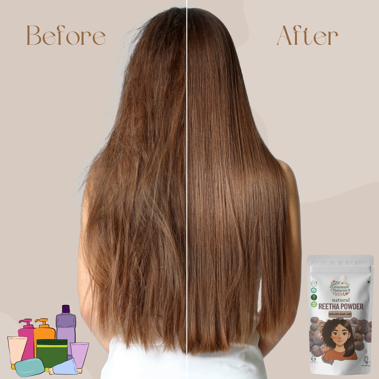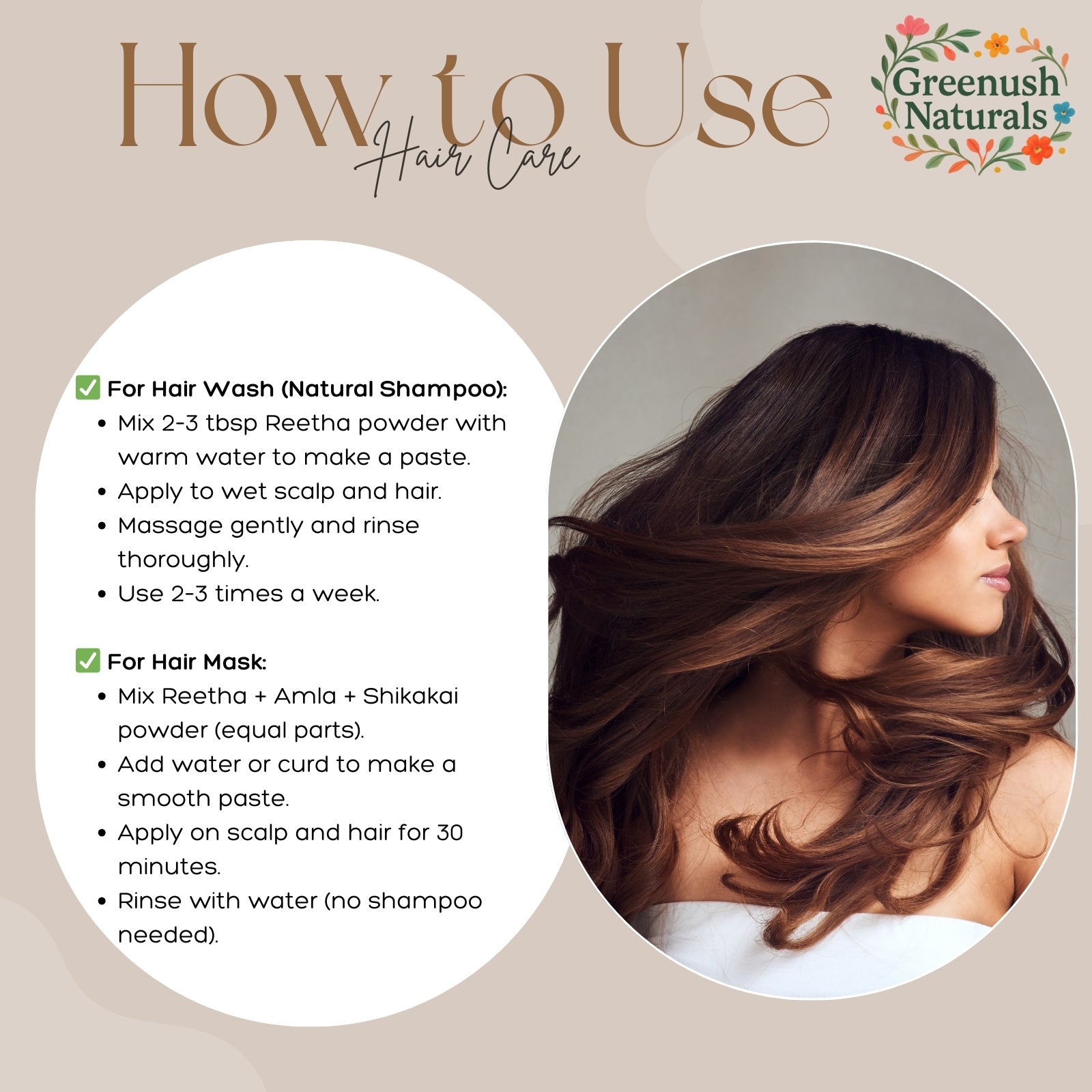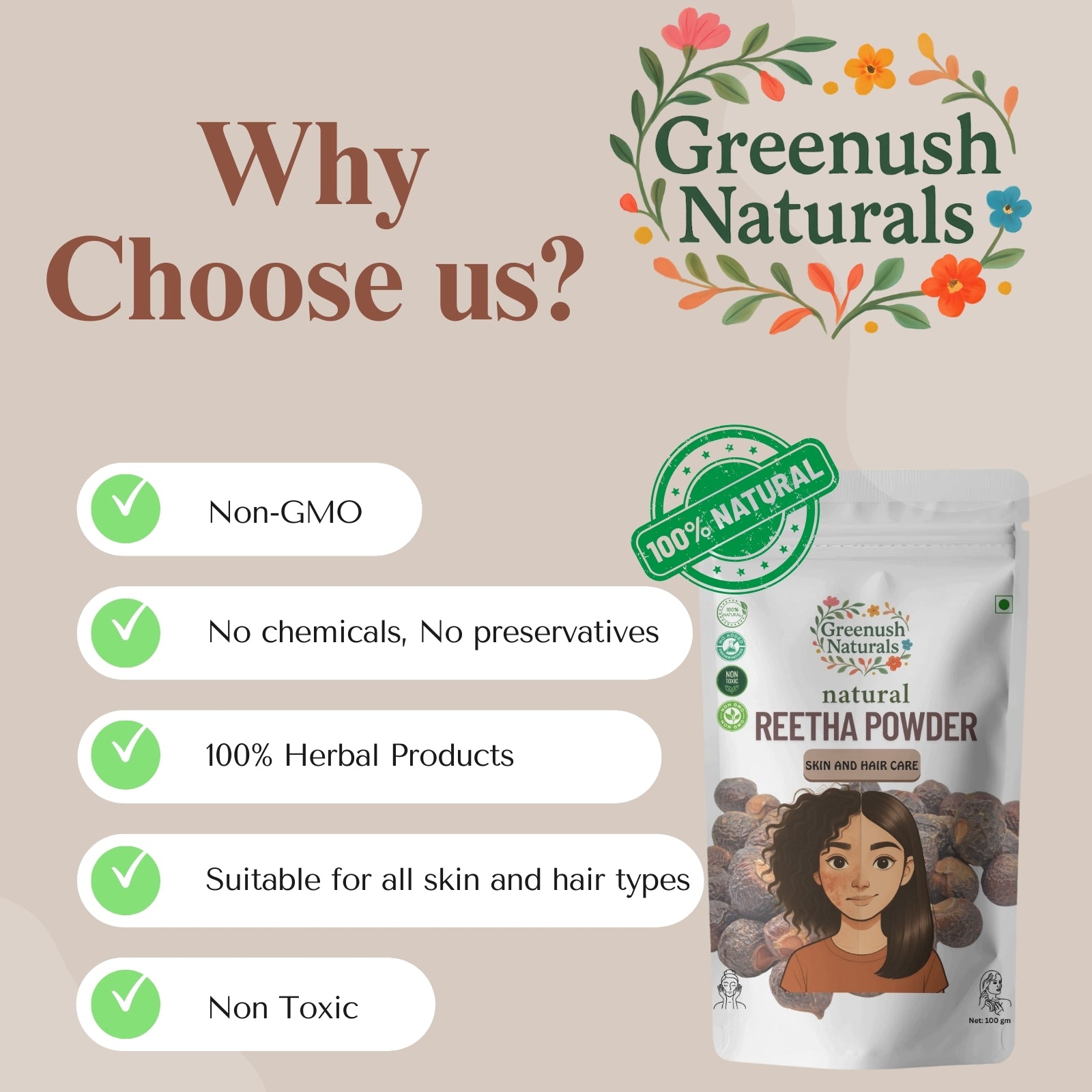 Enhance your skin, hair, Our Reetha Powder, brought to you by GREENUSH NATURAL, is a pure organic solution for both skin and hair care needs. With no added preservatives, this soapnut powder, also known as Antuvala Pudi or Aritha, boasts natural benefits for a healthier and more radiant appearance.
