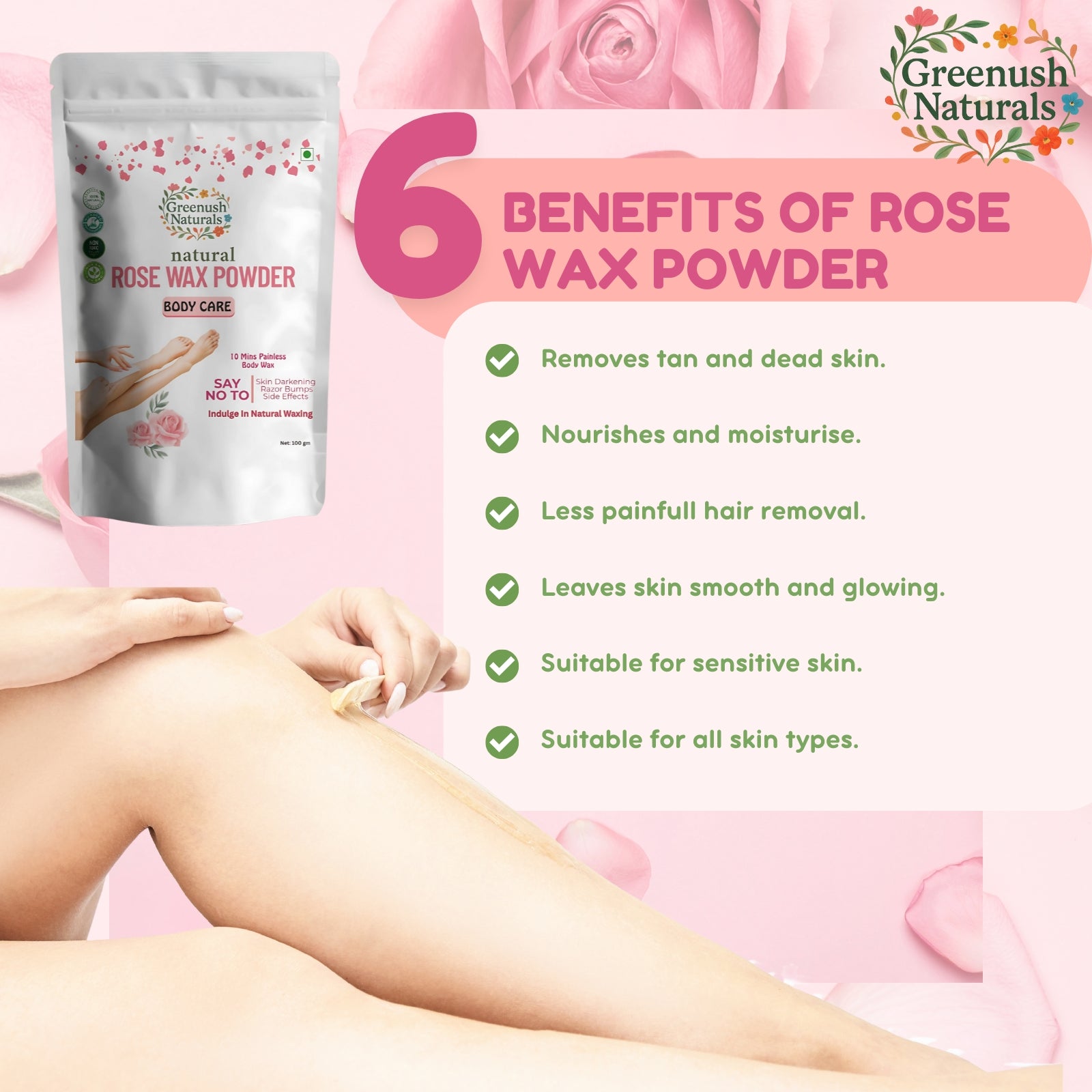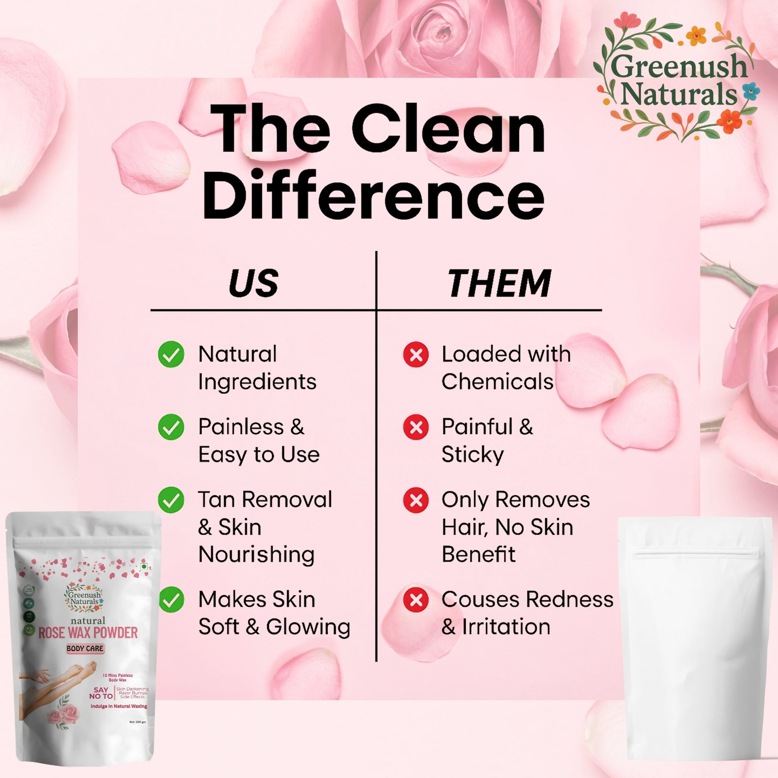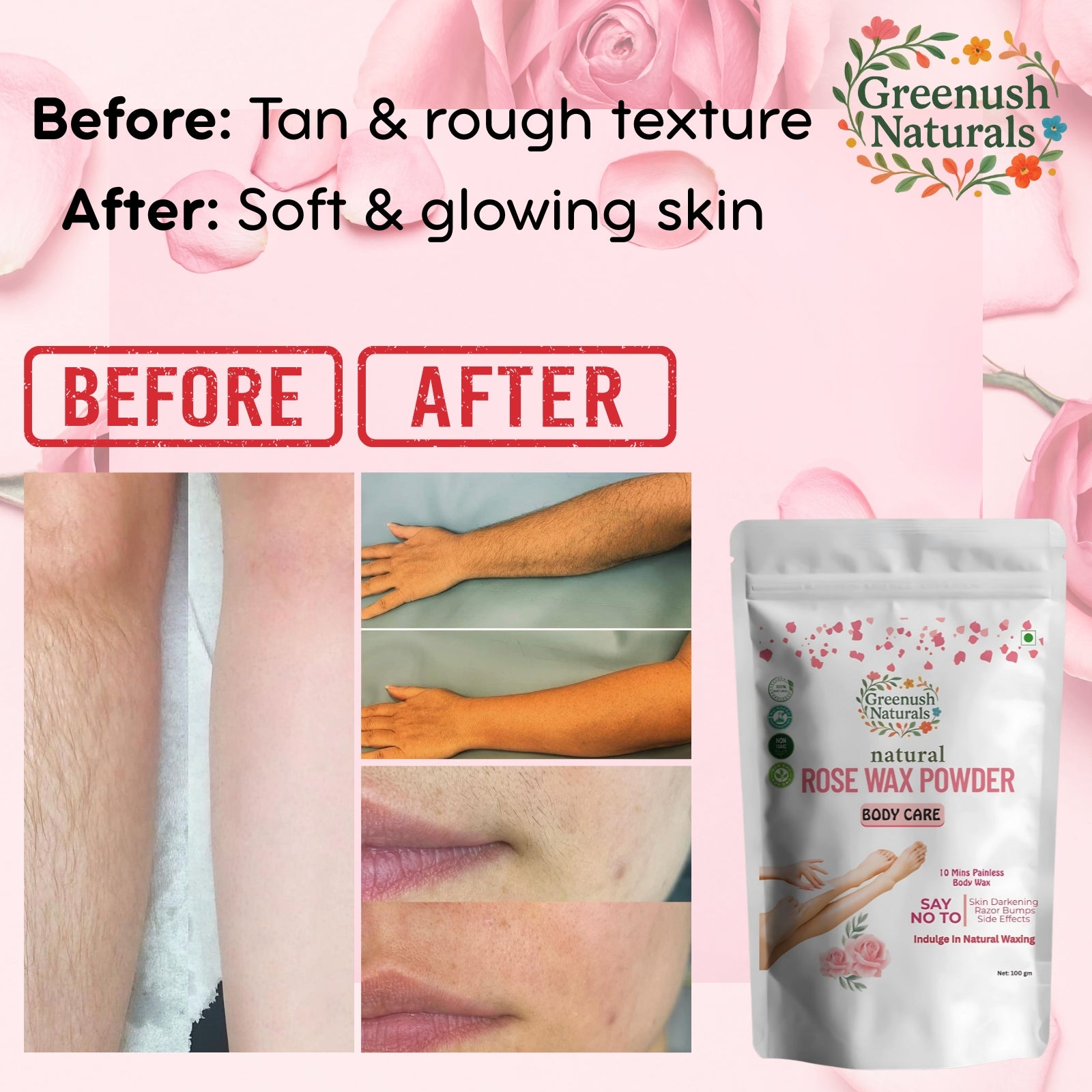 Experience gentle, effective hair removal with GREENUSH NATURAL Rose Wax Powder. Designed for all skin types, this natural formula removes body hair in just 10 minutes without harsh chemicals. It soothes the skin to prevent irritation and rashes, making your waxing routine painless and safe. Ideal for those seeking a pure, expert-grade solution for smooth, radiant skin.