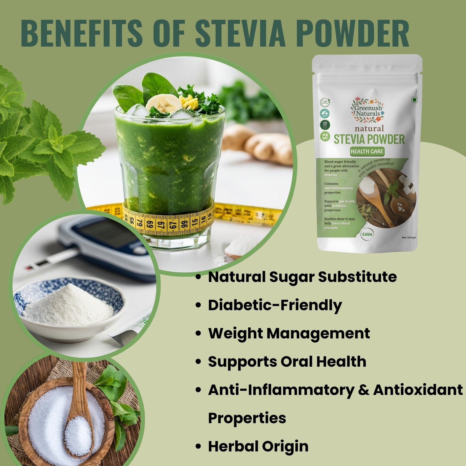 Introducing GREENUSH NATURAL Stevia Powder - the perfect alternative to sugar for those with diabetes or looking to cut back on calories. Made from 100% pure organic stevia, it is blood sugar friendly and provides a sweet taste without the added calories. Use it in cooking or as a sugar substitute for a healthier option.